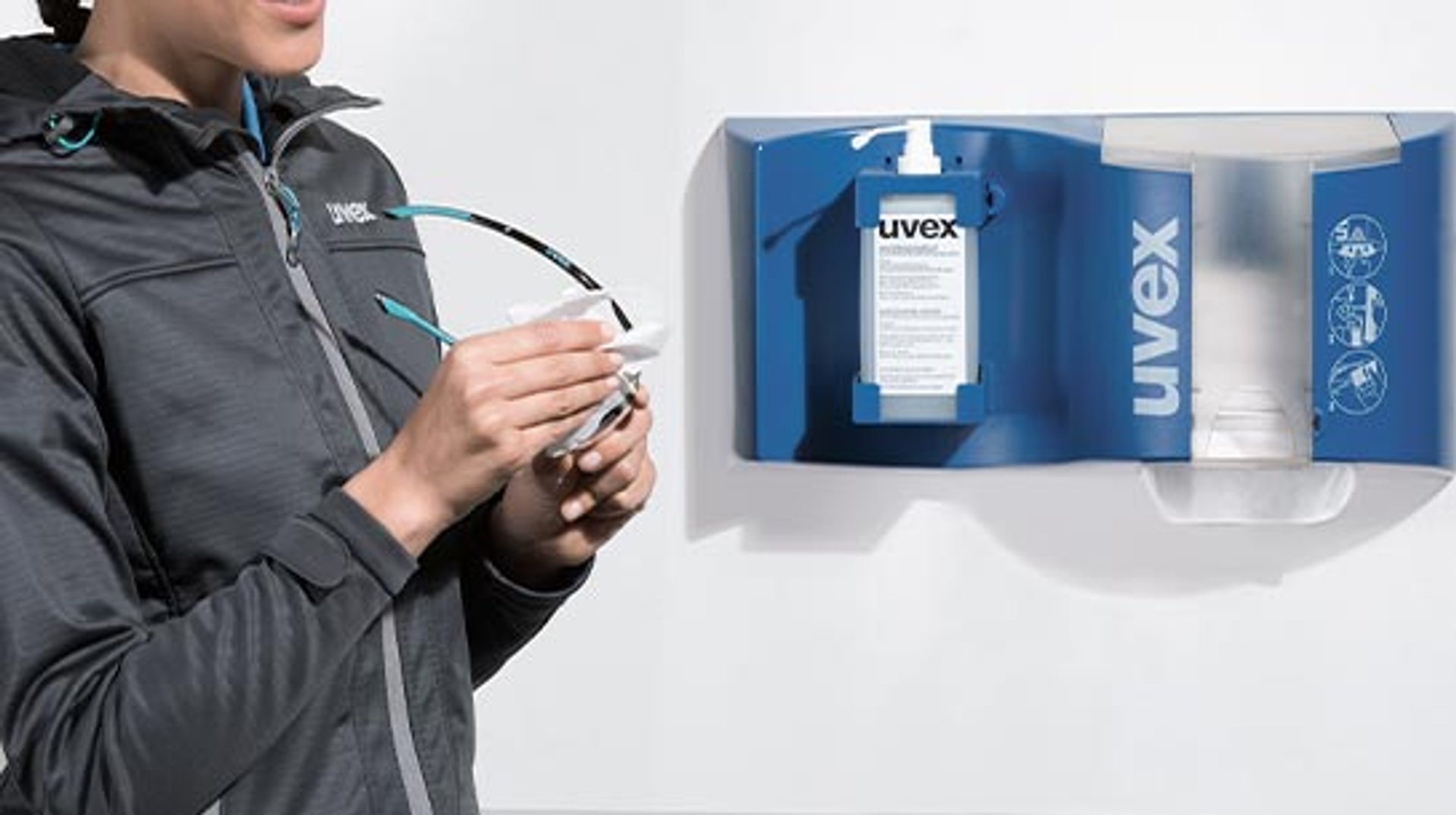 Our practical cleaning station can be attached with a wall bracket wherever is convenient, enabling you and your staff to access it quickly. The lens cleaning fluid and cleaning tissues are suitable for all uvex safety eyewear. Remember, only use uvex cleaning products to clean the lenses on uvex eyewear. This is essential to preserve the performance of the uvex lens coatings.