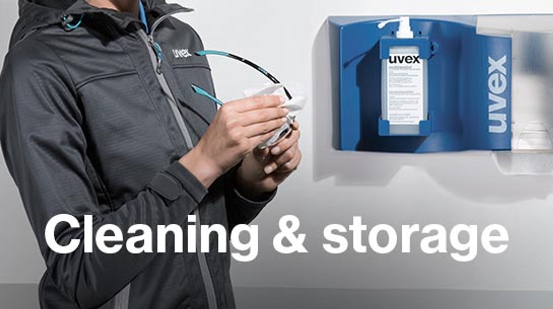Our practical cleaning station can be attached with a wall bracket wherever is convenient, enabling you and your staff to access it quickly. The lens cleaning fluid and cleaning tissues are suitable for all uvex safety eyewear. Remember, only use uvex cleaning products to clean the lenses on uvex eyewear. This is essential to preserve the performance of the uvex lens coatings.