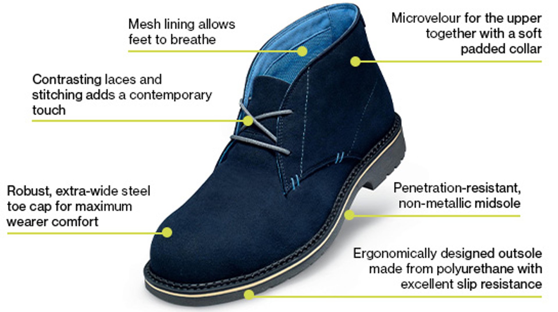 The new ultra-lightweight uvex 1 business is a multipurpose safety shoe that looks great with casual chinos, jeans or a formal suit. Available as a classic Derby style shoe in grey or navy, or the iconic Desert boot in navy, these safety shoes can take you seamlessly from the office to the site, providing either S2 or S3 protection depending on your needs.