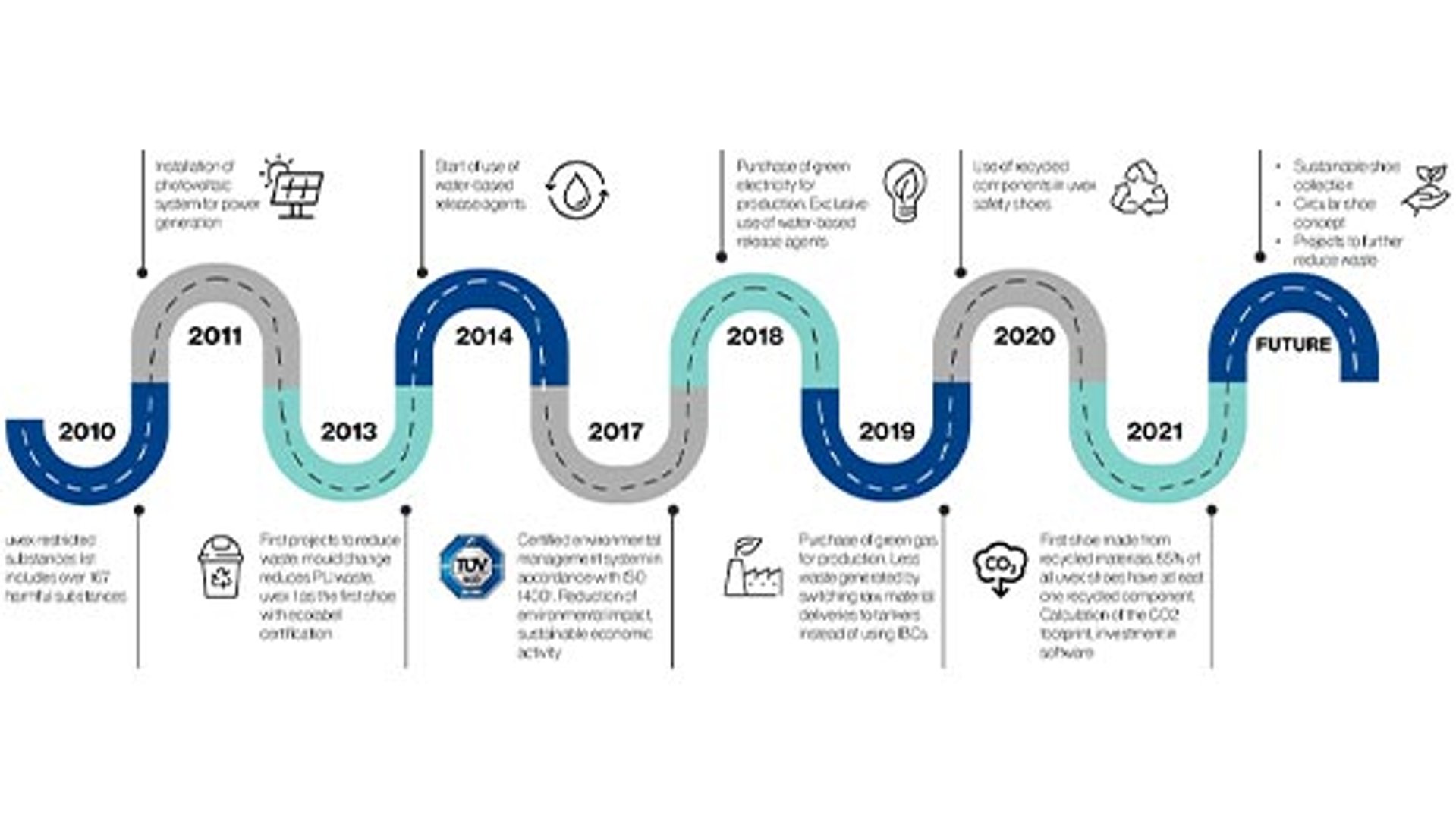 uvex is the first company to have succeeded in using the direct injection process to integrate granulate made using polyurethane waste from production processes into the midsole of a safety shoe, and then to launch the fully-certified product on the market. This allows us to utilise less raw materials and to return PU waste to the shoe production cycle, without compromising the performance of our i-PUREnrj technology, which provides cushioning and energy return across the entire sole of the foot, helping reduce wearer fatigue.