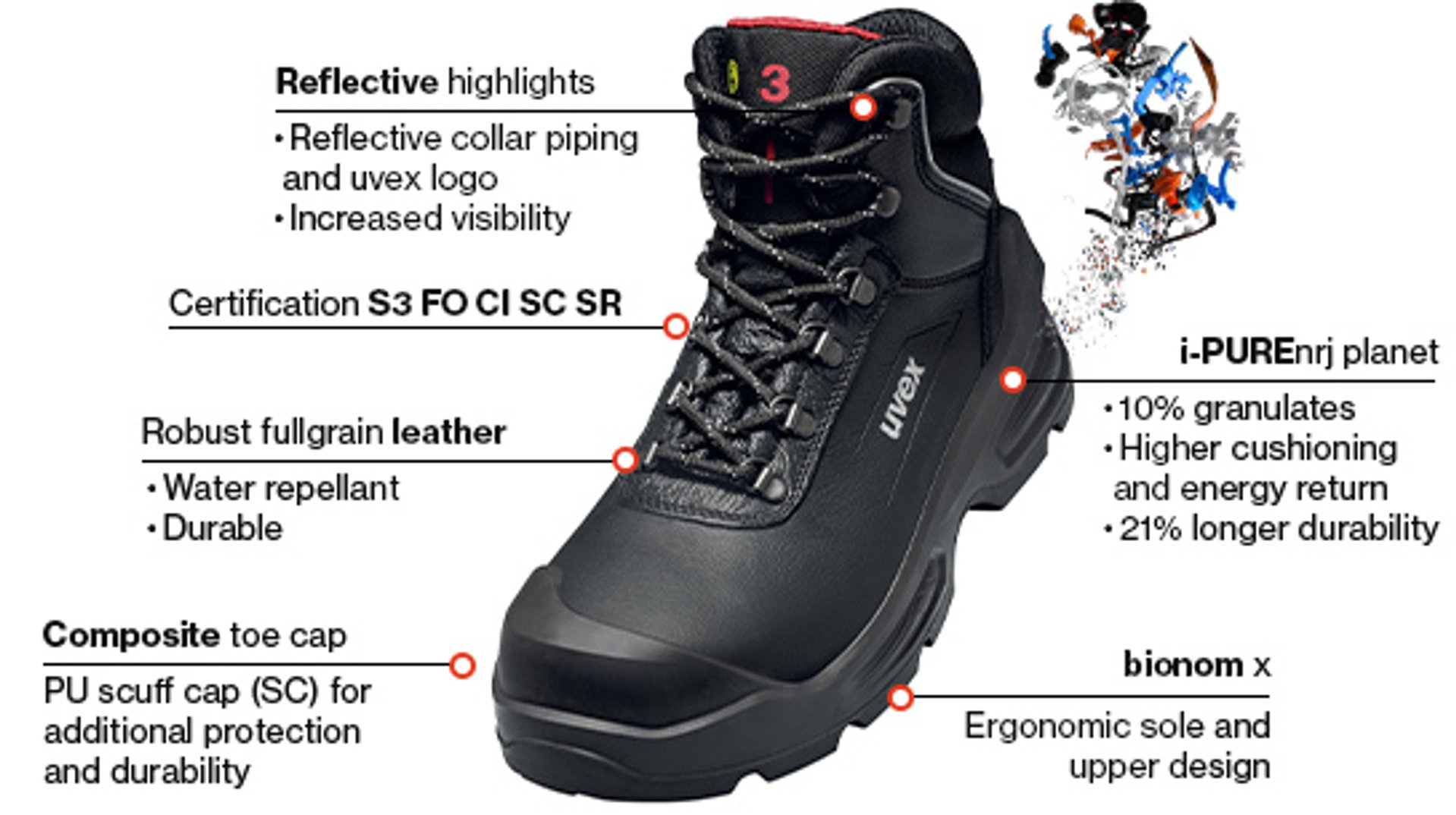 uvex’s innovative new polyurethane sole technology – i-PUREnrj planet – returns the landing energy over the entire sole unit back to the wearer. The sole of the uvex 3 quatro features anti-fatigue technology which returns 68% of the energy in the forefoot area, 65% energy return under the heel and has a shock absorption level of 44 joules, 2.2 times higher than specified by the standard, supporting the musculoskeletal system.
