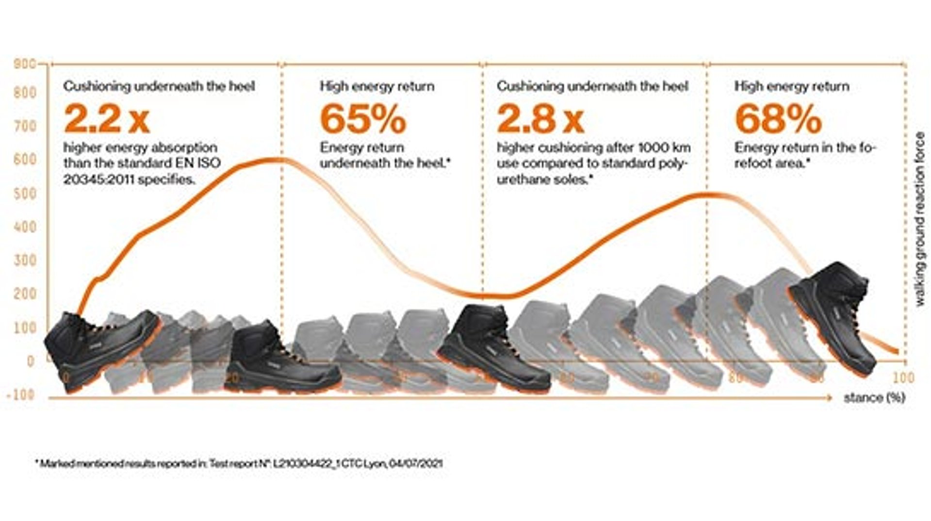 The lighter the footwear, the greater the shock absorption and energy returned means that the muscles in the foot, leg and back must work less hard, reducing strain and allowing performance to be maintained for longer. uvex safety footwear provides both cushioning and a stable footing reducing stresses on the body.