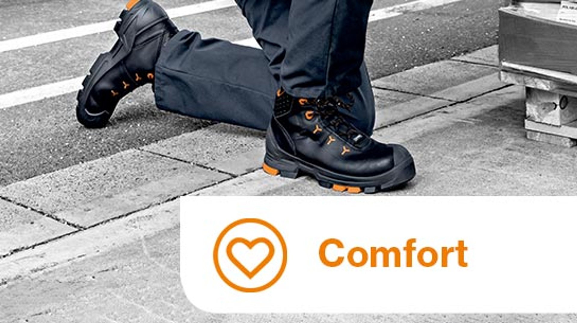 Comfort is extremely important for wellbeing. If the climate of a shoe is optimised so that the strain felt by the wearer is as low as possible or even totally removed, this reduces the mental pressure of being uncomfortable and therefore, reduces fatigue. Ergonomically designed footwear that supports the foot's bone structure and natural rolling motion, together with lightweight materials, temperature regulation, sweat management, shock absorption and cushioning. all play an important role in ensuring footwear remains comfortable throughout the working day. The lighter the footwear and the greater the shock absorption, the less hard the muscles in the foot, leg and back must work, reducing strain and allowing performance to be maintained for longer.